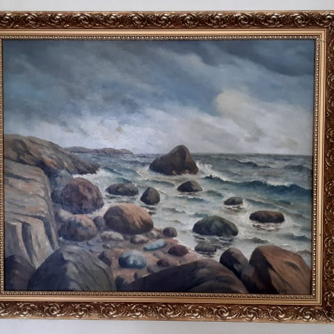 Flott stort innrammet oljemaleri ca 103 x 76, signert S Simensen, selges høystbydende. Selve maleriet er ca 82 x 54 . En liten skade i rammen. Prisantydning 4500 kr.