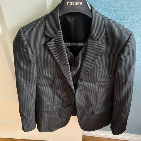 Kvalitetsdress gutt. Mørk grå dress m lyse striper. Bukse med justering i livet, vest, dressjakke med to innerlommer. Svært lite brukt. Merke Jingpinfashion. Størrelse 30.