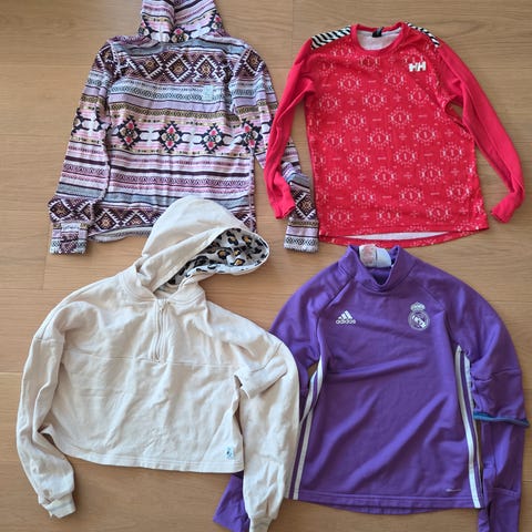 6 collage gensere selges samlet. 3 hettegensere, 3 uten hette. De er i størrelse 9-10år. Merker; Zara, Adidas, Among us, Benetton, LP boys, Cubus