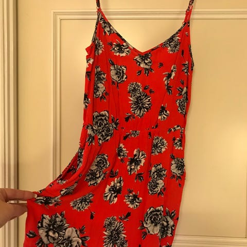 Pent brukt oransje playsuit med sorte prikker, stropper som kan reguleres og knyting i livet. Str 36. Må hentes i Kristiansand eller sendes om kjøper betaler frakt.
