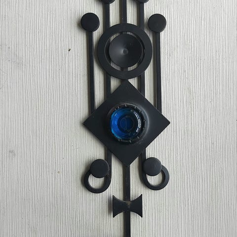 Flott eldre vegglysestake fra danske Dantoft i smijern og glass. Ca 38cm høy. En avskalling og litt rust på metallet. Kan hentes i Stokke i Vestfold eller sendes mot porto.