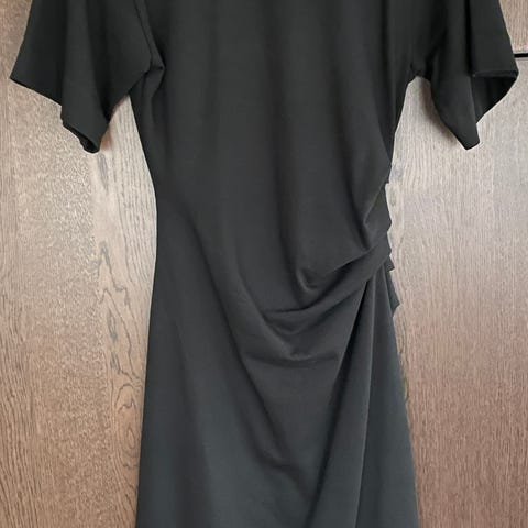 Klassisk sort kjole i eksklusiv ullblanding. Rynkedetaljer i utringningen og dekorative knapper foran. Glidelås bak. Bittelitt stretch i stoffet. Str 36 (normal i størrelsen). Brukt to ganger.
