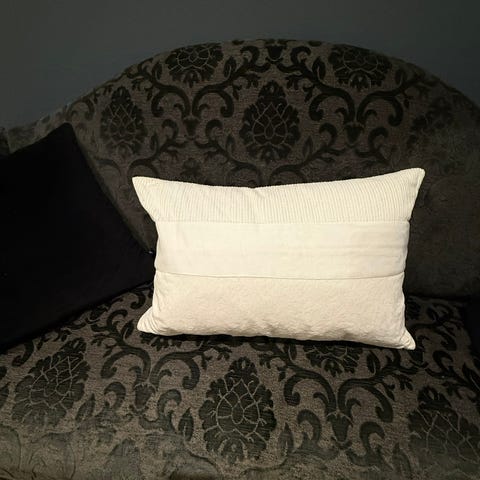 Rektangulær pyntepute med tekst på fremsiden "Faith". Grågrønn farge med hvit skrift - vil si hint av "slitasjeutseende" / shabby chic. Trekket er 100 % bomull og kan vaskes på 30 grader. Lukking med glidelås. Ca mål i cm: 61x41x13. Innerpute følger med. Begge kjøpt på Kid.