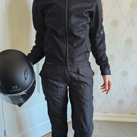 Nesten ny jakke. Brukt tre ganger for to sesonger siden. Pris inkludert hjelm. Hjelmen har slitasje som vist på bildet, den gled av motorsykkelen. Hjelm størrelse S (55-56). Pris kan diskuteres litt.