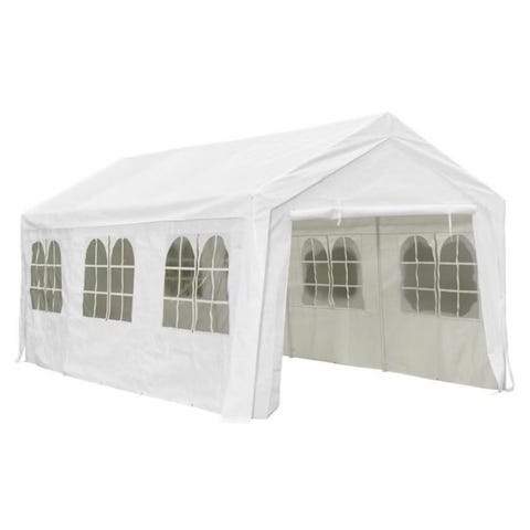 Hagemarkisen er laget av UV- og vannbestandig polyetylenmateriale, og er derfor veldig praktisk for utendørs bruk. Rammen er laget av rustbestandig stål, noe som gjør utemarkisen stabil og holdbar. Festteltet har sidevegger, hver med dekorative vinduer, og 1 sidevegg med dør med glidelåsåpning for enkel inngang. Hagepaviljongen er lett å montere.