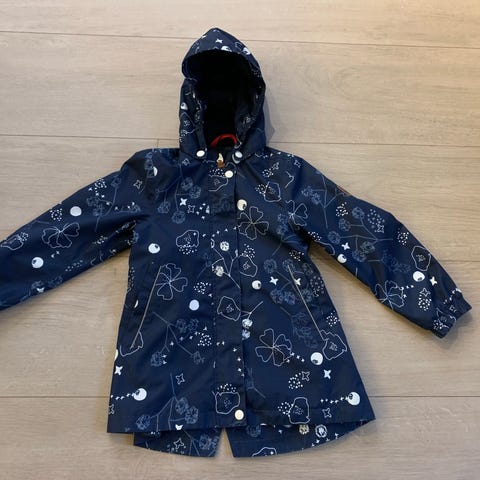 Pent brukt jakke i str 116 fra reimatec. Jakken er hel og pen, og eneste anmerkning er litt slitasje helt nederst på ermene (se bilder). Jakken er ikke foret, men tåler både vind og en del regn - men det er ingen regnjakke. Passer best til vår, sommer og tidlig høst.