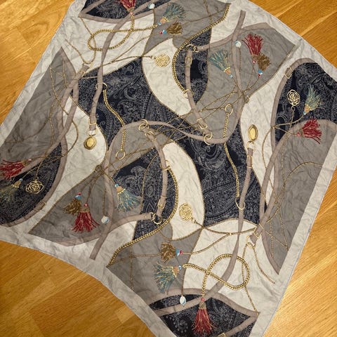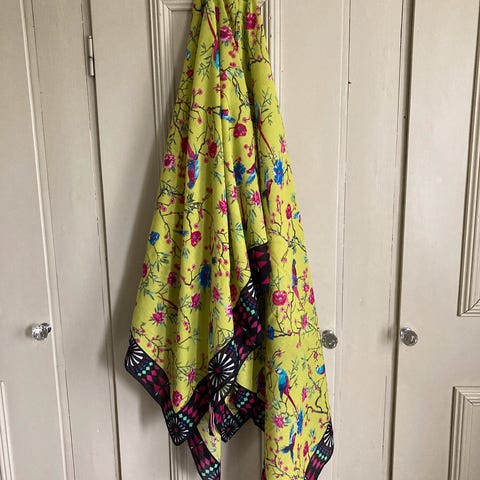 Vintage avlangt, smalt skjerf fra amerikanske Vera. Klassisk, sobert utseende med vakre blomster, inkludert liljekonvall. Spisser i endene. Måler 19x149 cm. Maskinsydde kanter. Skjerfet er i 100% polyester og kan vaskes i maskin.