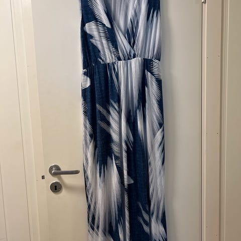 Blå og hvit B.young maxi kjole med blader i str 34. Den er brukt et par ganger. Det er en liten rød flekk på den foran (avbildet), mulig leppestift. Kjøpte den i 2014-2015. Den er ikke lengre min stil og har ikke vært brukt på flere år, derfor selges den.