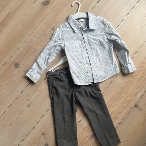 Selger finklær til gutt i str. 86. Klærne er kjøpt på nameit og buksen er en dressbukse. Den hvite og blå skjorten har dessverre noen småflekker som man ser hvis man ser godt etter så de er med på kjøpet av dressbuksen hvis ønskelig.