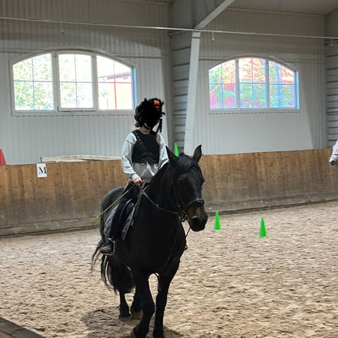 Jeg kan alle gangartene, rir både på bane, tur og sprang, og liker å variere slik at hesten/ponni trives og har det gøy🩷
