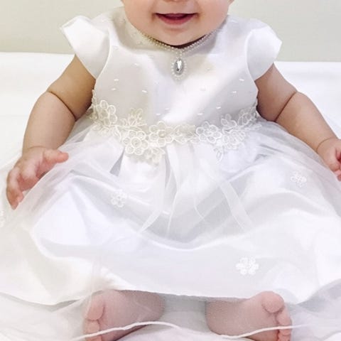 Vakker dåpskjole, organza materiale, dekorert med rhinestones.På kjolen er det et brodert bilde av en Virgin Maria. Dette antrekket er laget av et designermerke som opprettholder det høyeste i kvalitet og supersøt stil og verdi.(Laget i USA)