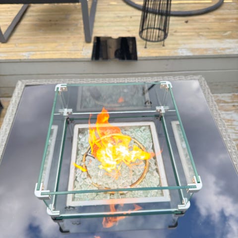 Gassbord 125cm i diameter. Høyde 65cm. Glass stein følger med som holder å varmen. Kommer flatpakket =130x130x 25. Selges privat , da firmaet er lagt ned.