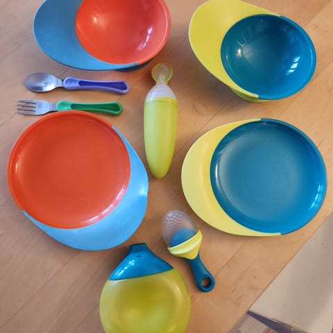 I silikon, lette å rengjøre, enkle å holde. Våre to babyer elsket det. Veldig god kvalitet, er i veldig god stand.
