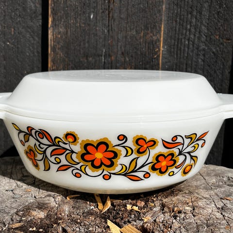 Vintage ildfast opalin gryte med roser