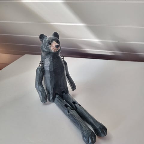 Morsom trefigur med en bjørn som spiller piano. Rører på seg når du drar i snora. Ca 15cm bred og 13cm høy. Lite slitasje. Kan hentes i Stokke i Vestfold eller sendes mot porto.