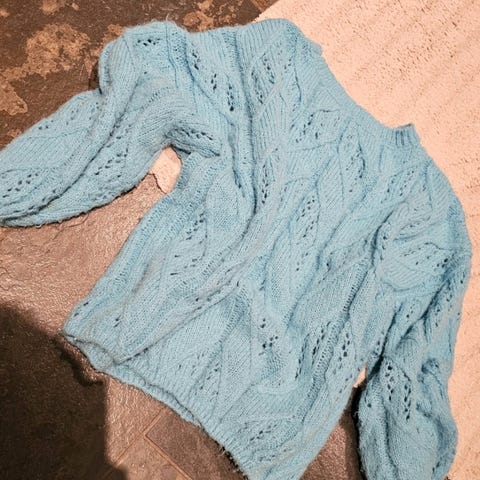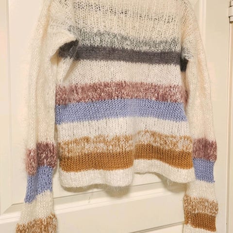 Veldig fin strikke genser. Den er litt nupper på (se bilde) men den kan fjernes lett med nuppemaskin ellers ingen annen bruksmerker som hull eller flekker. Den kan hente, sende eller møte.