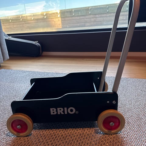 BRIO gåvogn treleke i svart med hvitt håndtak og hjul med hvite og røde detaljer. Vognen har et åpent lasteplan som gir plass til leker eller andre småting barnet kan frakte med seg. Egnet som støtte når barn øver på å gå og for lek innendørs. Laget i tre med metallhåndtak og plastdekkede hjul.