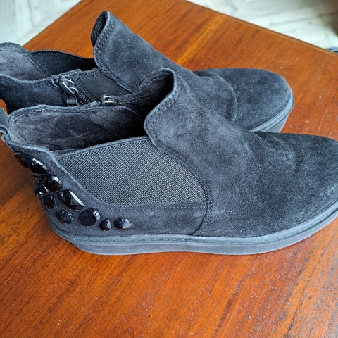 Skoene er så vidt brukt inne, men de er store i størrelsen så er mer som str 39..De ser litt grå ut kanskje på bildet, men er svarte...