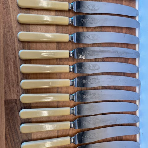 Atkinson Bros Sheffild, 6 fruktkniver og to smørekniver selges samlet. Fra 1950 tallet.