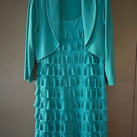 Pen kjole i plissert stoff STR. XL, veldig tøyelig, har underkjole og skjerf. Kjole pyntet med blomster, som er populært nå. Mål i brystene 55x2=110(men lett utvides), lengde er 115cm.