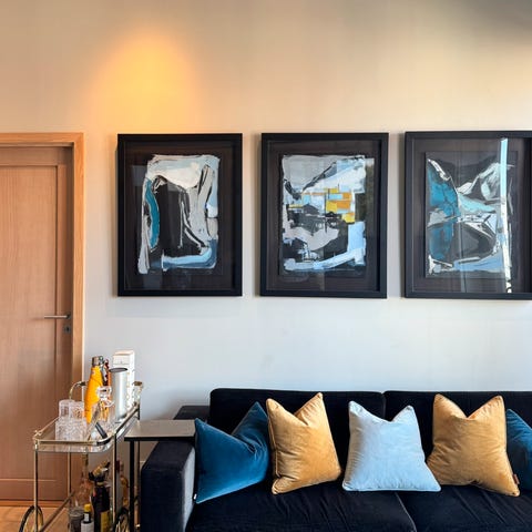 2 stk litografier av Karl Hansen. Begge har samme mål, ca 61 x 63 cm, hvit ramme med glass; mål 87 x 90 cm. Den gule versjonen er nummer 20/43 og den oransje nummer 17/60.