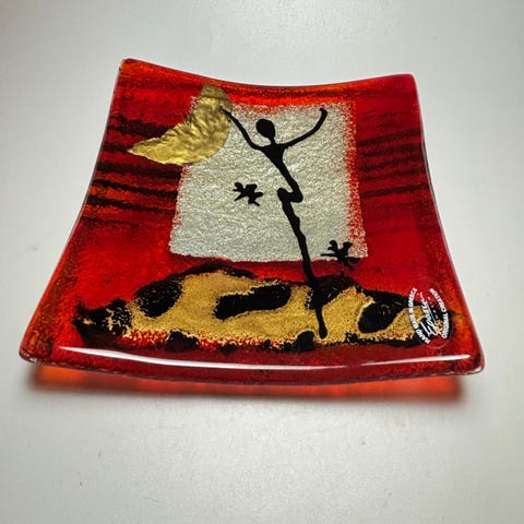 Jeg selger et svært pent lysfat/godteriskål fra Raku ceramics i Kroatia. Tipper ca 2015. Det tykke fatet i sort/hvitt/metall er usymmetrisk kvadratisk og står på fire ben. Det er stilrent og en blikkfanger. Det er et lite nagg på kanten under (se bilder), men ellers er fatet uten skader. Merkelappen sier: Amfora -Exim / Unikat Raku / Pazin, 052 621 787