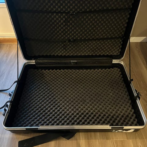 Kofferten er polstret og har 3 polstrede lag for hjulsett. Har ikke sykkelhjultrekk, men bobleplast.