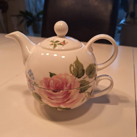 En søt servise, jeg fått for lenge siden av min farmor. Jeg har selv aldrig brukt den, det er en tekanna + 6 kopper. Ikke noen missfarging eller bruksmerken.