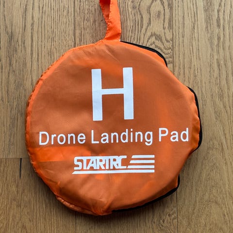 Landingsplattformen er 75cm i diamater når den er foldet ut, sammenfoldet er den kun 29cm i diameter. Plattformen er orange på den ene siden og blå på den andre og markert med en H. Videre følger det med 3 plugger for å feste den til bakken, samt refleksstriper du kan klistre på for å gjøre den merk synlig i mørket.
