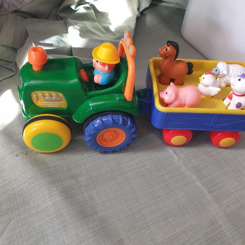 Ukjent merke traktor lekebil med henger i plast, flerfarget. Lekesettet består av en grønn traktor med førerfigur og en gul/blå tilhenger. Hengeren har plass til små figurer eller dyr, som kan settes i formede hull. Passer som rollelek-leke for barn som liker kjøretøy og gårdslek. Laget i hard plast med avrundede kanter.