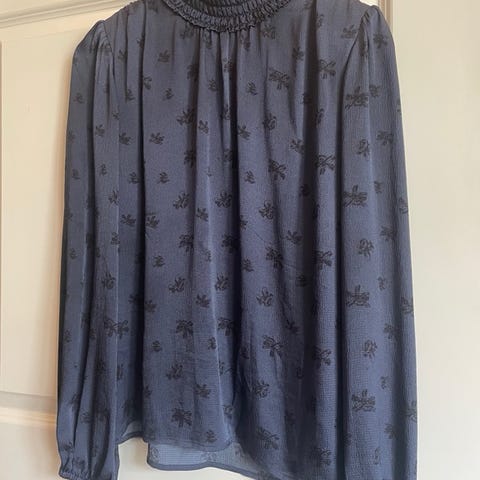 Ganni -bluse i 100% viskose. Størrelse 40. Mål: lengde: 56 cm, Brystmål: 48cm fra armhule til armhule. Blusen ( selve kroppen) er helfóret med viskosestoff. Glidelås i ryggen/nakken. Rund hals, store, rynkede armer. Farge: lys blå med mørk blå mønster. Brukt to ganger. Selges for 450kr