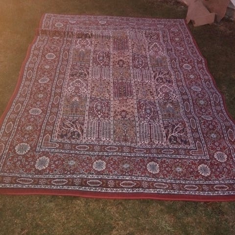 En sengeteppe og 3 puter (alt er nytt). Må hentes selv!