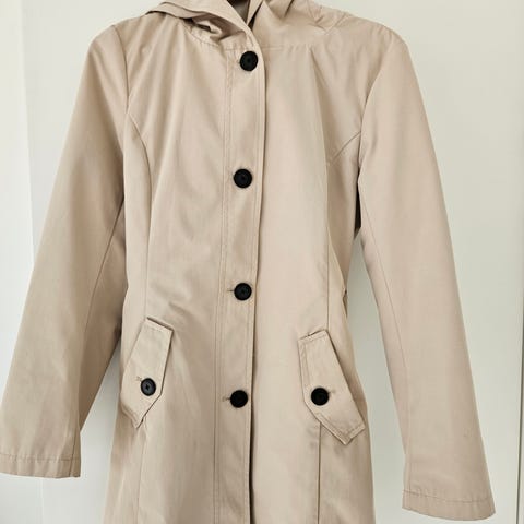 Selger en pent brukt regnjakke i kremhvit farge. Jakken har et stilrent og tidløst design, og passer perfekt til både bybruk og turer i lett regn.