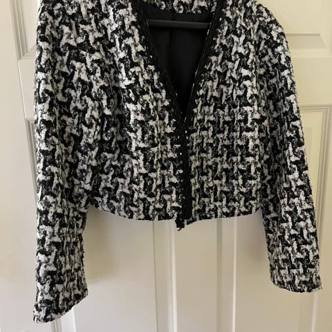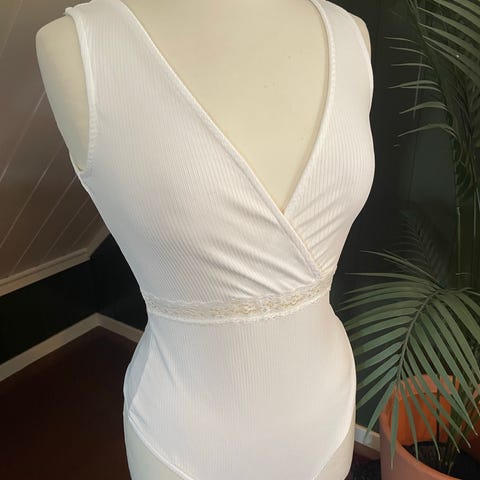 Nydelig sort blondebody. Ubrukt. Lys hudfarge nederst med knapper mellom beina. Delvis gjennomsiktig. Veldig fin, men alt for liten. Størrelse xs-small. Lukkes med knapper i nakken og har åpning i ryggen.