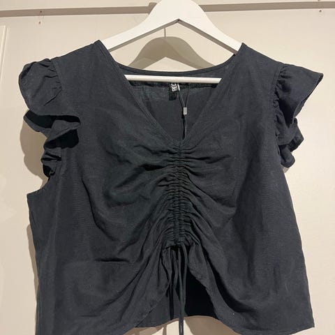 Sort topp med legg og broderier. Rysjer som går foran, bak og over skuldrene. Knapp bak i nakken. Str L (litt liten i størrelsen). Brukt et par ganger.