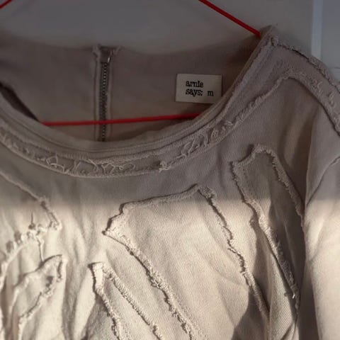«Arnie says» genser i 75% bomull/25% polyester. Mål: lengde 50 cm, bredde 45 cm, ermlengde 45cm. Størrelsen er i praksis en xs, nen oppgitt som s i merket på genseren