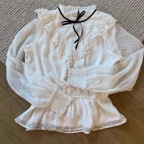 Marineblå blondebluse fra Cubus. Armene er bare blondestoff, resten har forstoff som gjør at den ikke er gjennomsiktig.