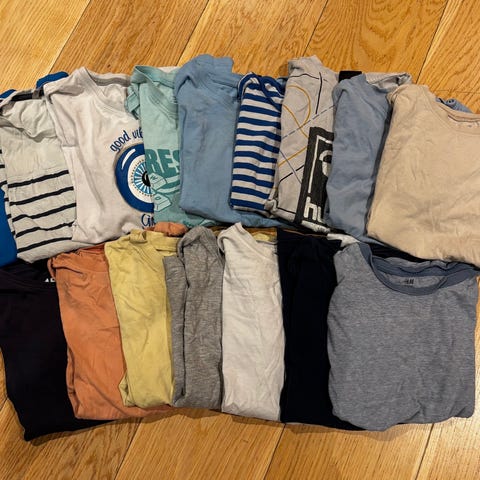 4 t-skjorter, 2 lang arm genser, 3 joggebukser, 1 shorts og 1 jeans selger samlet.