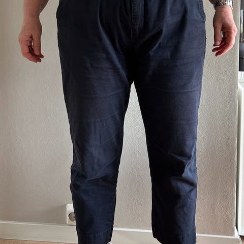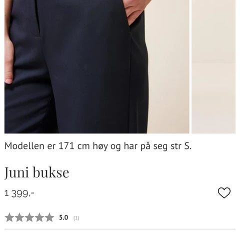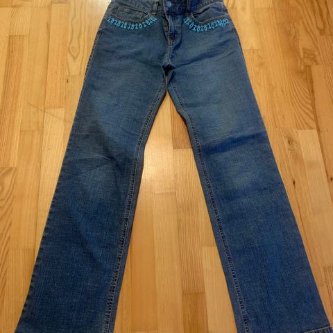 Bukse i beige/nesten lys, gylden nyanse og sorte blomster. De er ganske stive med har myk og behagelig lining. Det er lommer på rumpa (hvis de løsner sømmen), ingen lommer på fronten. Pent brukt, skadefri.