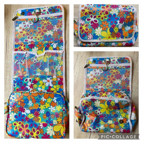 Selger en knallgult stor toalettveske i retro farger. Gammel men i god stand. Noe flekker inni.