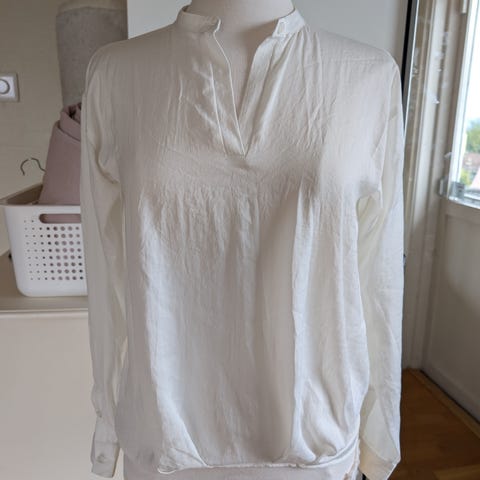 ICHI bluse. Den er kun brukt ved en anledning. Selges fordi den er litt for stor for meg. Str 34, men den er stor i størrelsen - tilsvarer en S/M, og er veldig fleksibel i stoffet. Nyvasket, hel og pen. Oppbevart i et dyre- og røykfritt hjem.