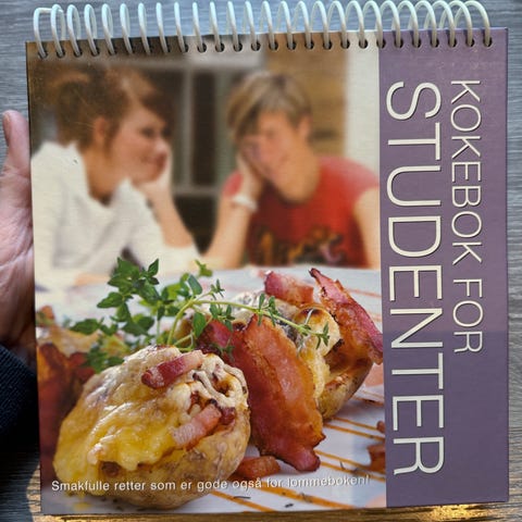 1 flott og annerledes kokebok «KOKEBOK FOR STUDENTER». NORSK FAKTA FORLAG, 2 opplag 2013. Kokeboken er «Som ny». Høyde 22 cm, bredde 20,5cm. Arkene brettes over, og kokeboken kan stå. Arkene er kraftige. Se alle bildene. Kokeboken kan sendes, eller hentes her i Sandefjord, eller avtale henting i Tønsberg på Tolvsrød. Kan også sende via Finn.no «helthjem», koster kr. 82,-, inntil 5 kg! Forsikret og med sporing.