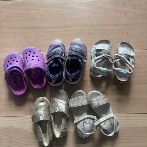 Fem par sko. Brukte men mye bruk igjen. Strl 30 på alle. Crocs fake) , havianas, badesko, sandaler. Rosa og hvite.
