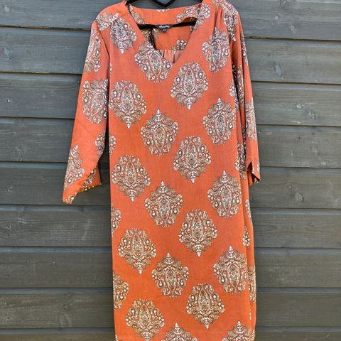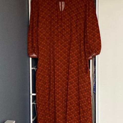 Belte medfølger men kjolen er fin når den brukes uten belte også.. Den har pene legg ved skulder og et lite legg bak på ryggen. Liten splitt i hver side.