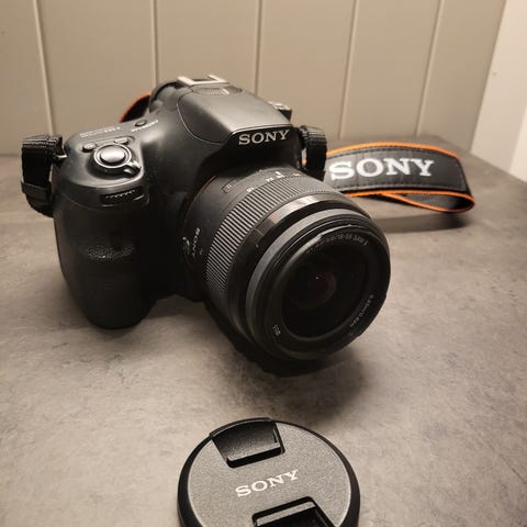 Sony a58 er som ny, har kun blitt brukt noen få ganger ellers har den ligget i skapet. Det føler med en ekstra objektiv hvor man kan enkelt ta bilder av lange avstand. Følger med veske og alle de delene som er på bilde.