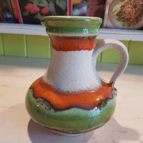 Typisk 70-talls morro i oransj og brunt . Stemplet under JASBA. Formet som en mugge , egner seg best som vase . Ingen skader .