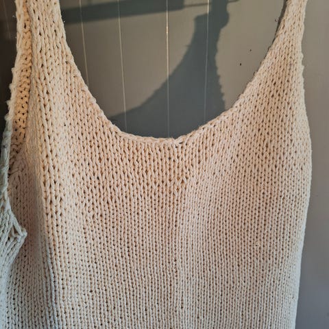 Toppen er heklet i bomullsgarn (Muskat), derfor litt tung.