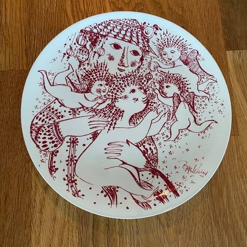 Selger en nydelig porselensplatte som måler 15 cm i diameter.