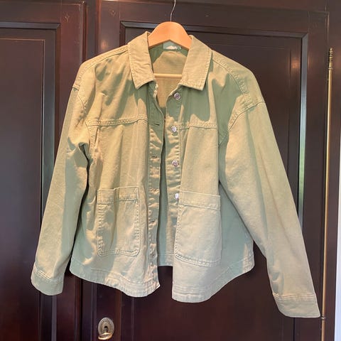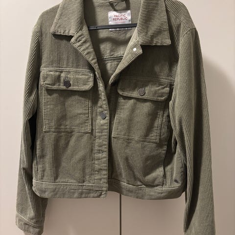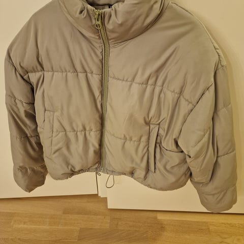Farget mørkegrønn. Kortere modell med strikk rundt livet. Dette gjør at jakken er noe luftig og større i fasongen.