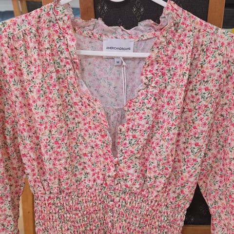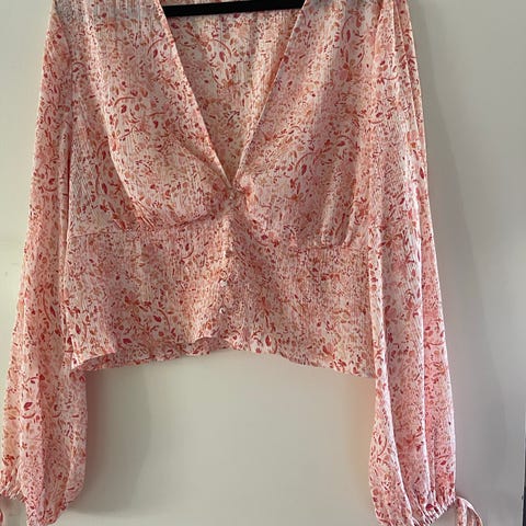 Fin, kort og luftig topp. Lappen er klippet av men er kun prøvd på. Strikken i livet gir et feminint uttrykk. Passer til både bukser og skjørt. Fra HM. Fargene er oransje, rosa, beige og litt bruntoner.
